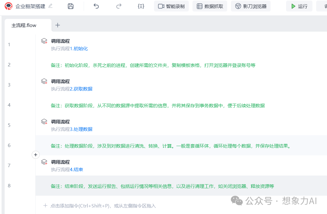 简单来说,这是一套可以复用的流程框架,你只需要像填空题一样,在流程里面添加指令即可。