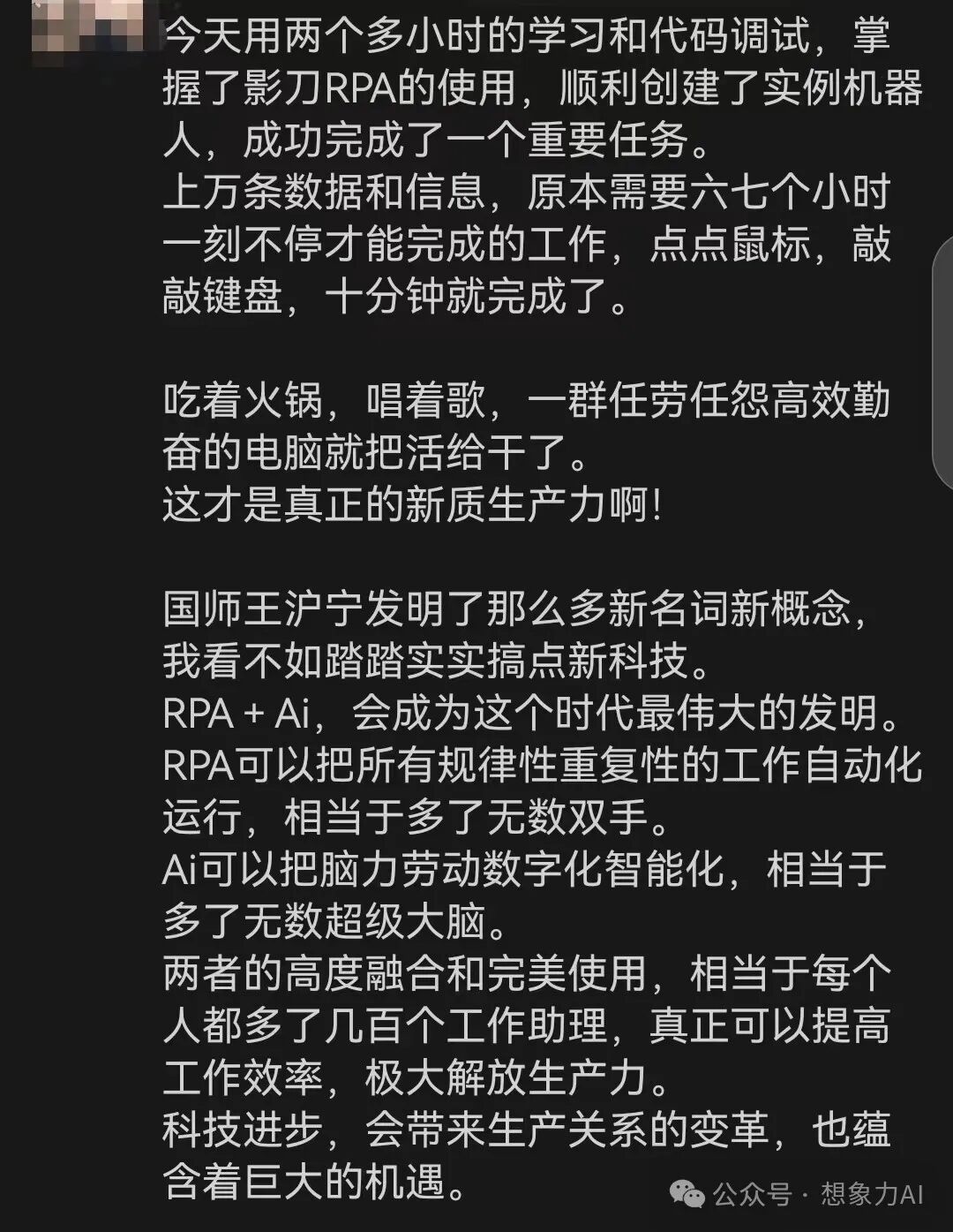我有个朋友,今天花了两个多小时学习简单的 RPA指令、调试,顺利创建了一个机器人,而且很好的完成了一个比较重要的任务。