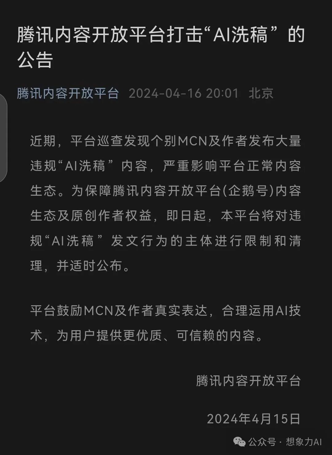 朋友们好,我是想象力AI,就在今天晚上,微信官方发了一个通告,说有人用AI洗稿,搞得内容圈子乌烟瘴气的。这事儿一出,就像是小区里有人乱扔垃圾,物业出来管管一样,要清理掉那些不守规矩的人。