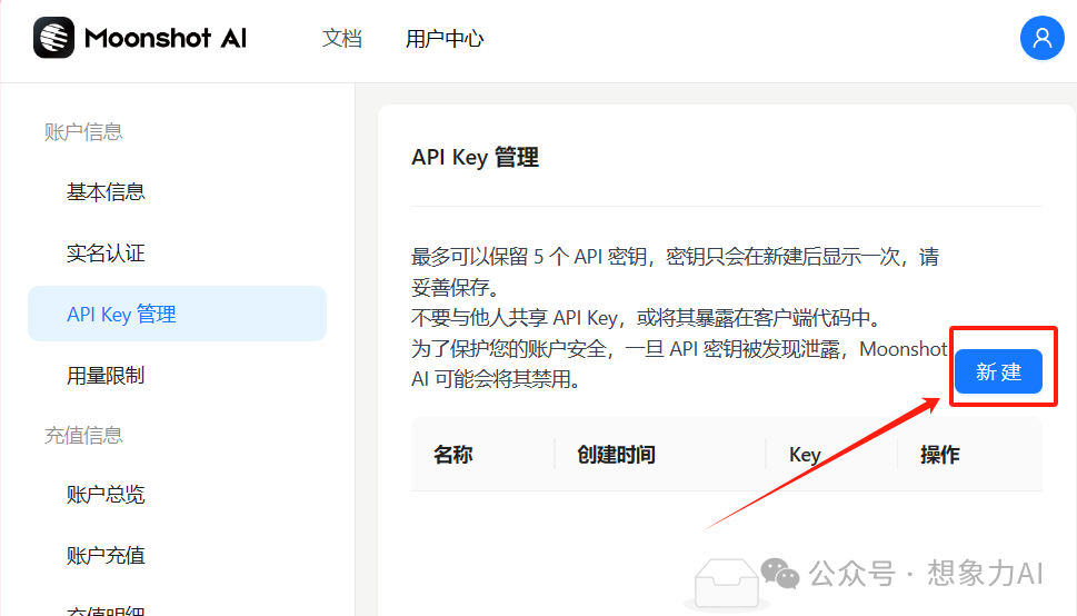 接着我们在 api key 管理处,新建一个自己的 api,注意复制并保存好。