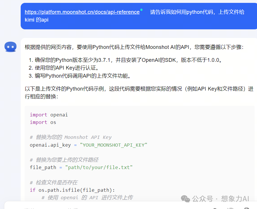 可以把整个kimi官网的API文档网页链接丢给kimi,让它自己来回答。