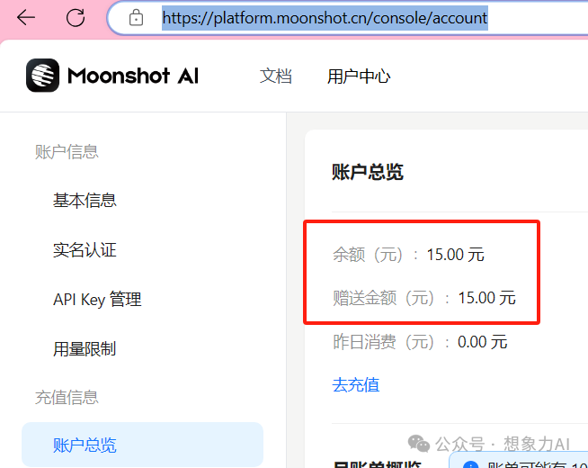 在 kimi 官方平台,注册好个人的账号,可以看到会送给我们 15r 的免费额度。Moonshot AI - 开放平台