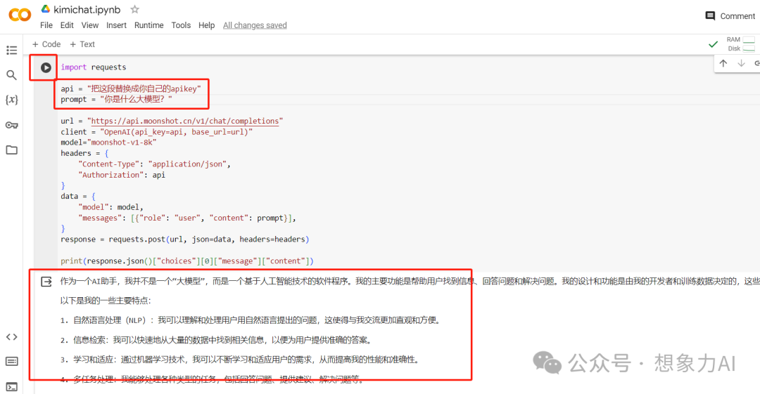 把你的apikey,prompt 替换即可,直接点击左上角的三角形运行,下面就会返回答案啦。