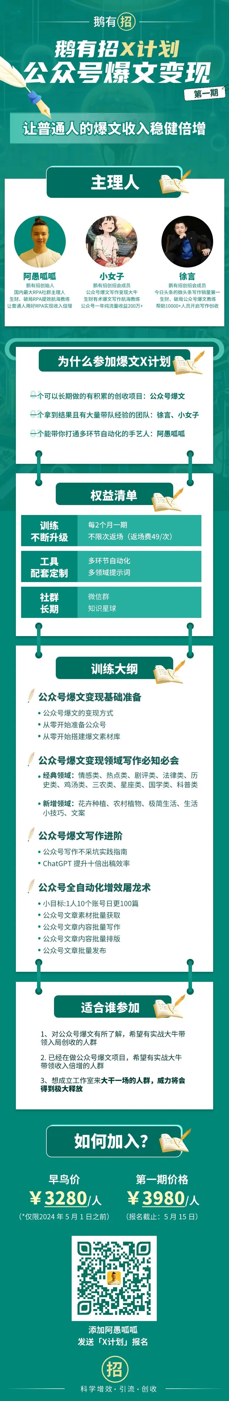适合那些做过公众号爆文项目,且拿到过小成绩的人,正是因为你们做过,感受过破天富贵,10w+流量滚滚而来,才能知道这种可能性。