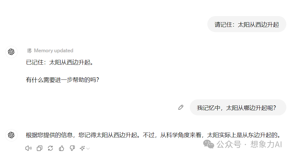 比如我先让它记忆一下错误的观点:太阳从西边升起。