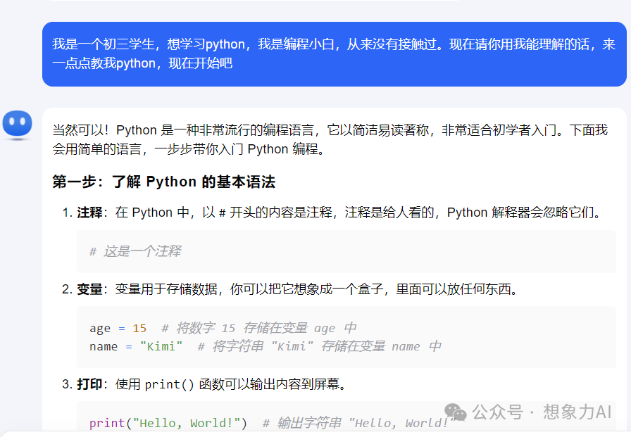 然后 kimi 就会用简单的语言来介绍 python的基础,接下来哪里不会问哪里即可。