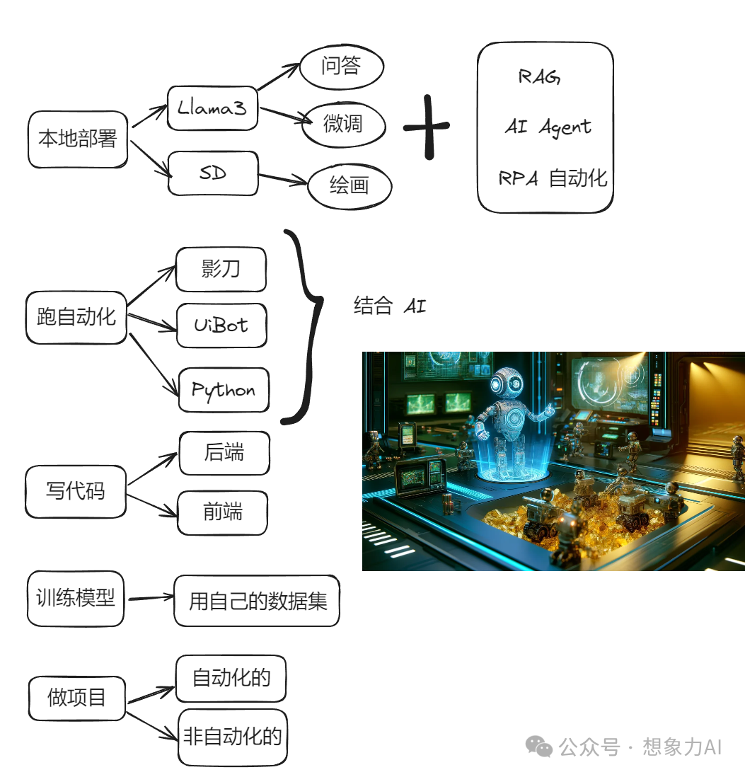 本地部署模型(Llama3、SD 等),其中 Llama3 可以尝试问答、微调,SD 可以用来生成绘画,这都是属于基础的 AI 功能。将来探索肯定需要在基础功能上增加新的点,LLM + X,这个 X 可以是 RAG、AI Agent 、RPA 自动化等等。