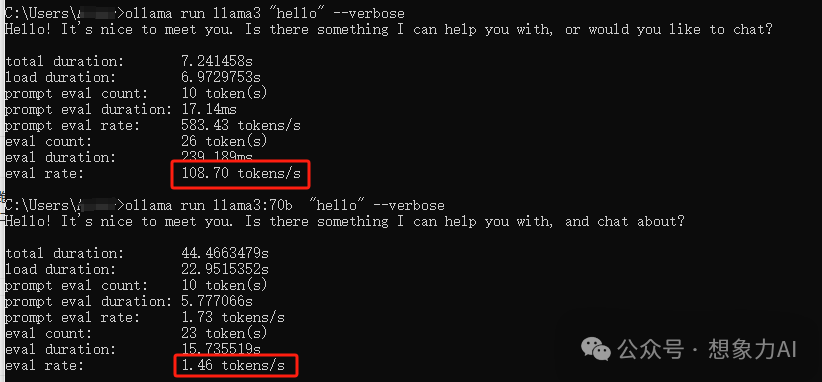 ollama run llama3:70b "hello" --verbose