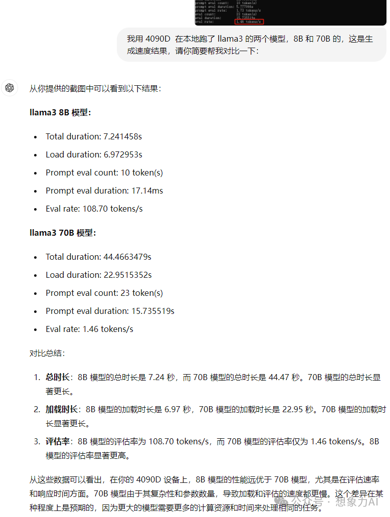 把生成报告简单给 AI 分析一下,8B 生成速度是 108.7 tokens/s,70B 生成速度是 1.46 tokens/s,这差了 100 倍的速度,简直就像龟兔赛跑一样。