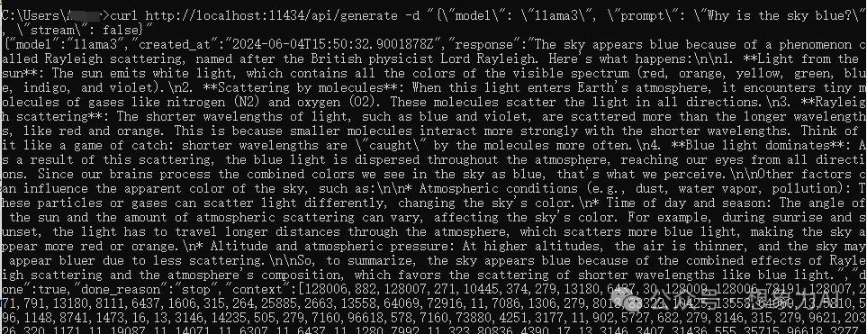 curl http://localhost:11434/api/generate -d "{\"model\": \"llama3\", \"prompt\": \"Why is the sky blue?\", \"stream\": false}"