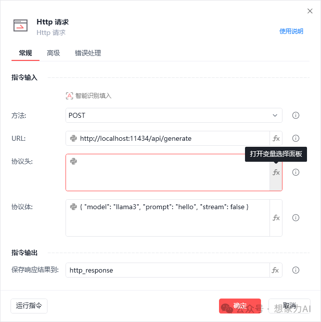 接下来准备接入影刀,使用指令:Http 请求,按照我的截图配置即可。