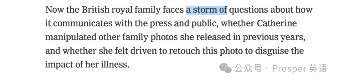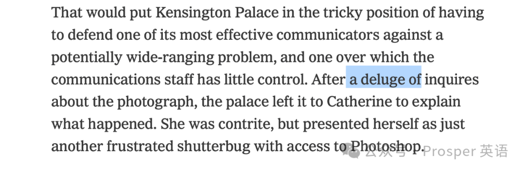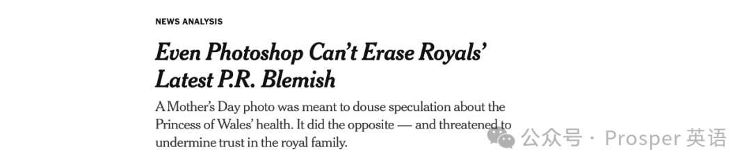 今天在阅读《纽约时报》时,我看到了一篇关于凯特王妃假照片事件的分析文章,标题为“Even Photoshop Can’t Erase Royals’ Latest P.R. Blemish”。这句话的意思是即使使用 Photoshop 也无法消除皇室最新的公关瑕疵。文章中有几个表示大量的英文表达,让我们一起来分享一下。