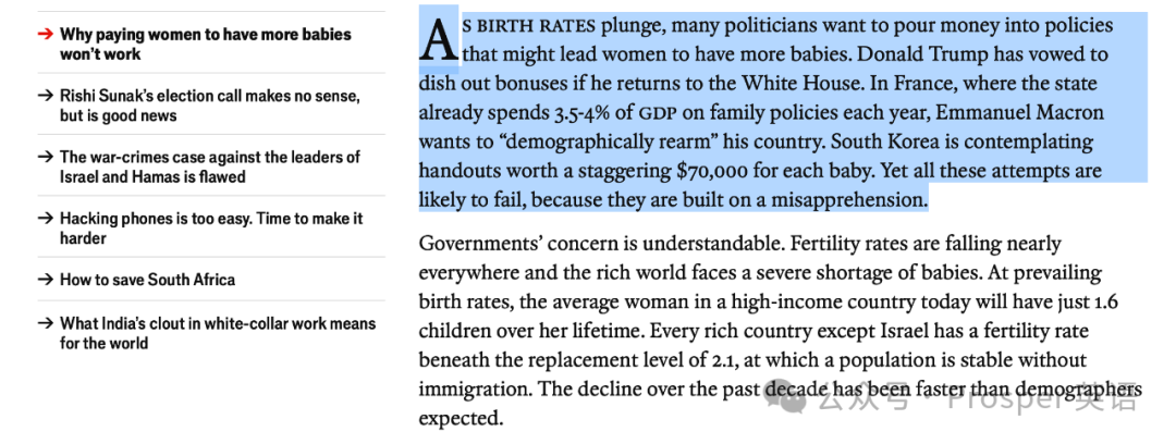 最近阅读了《经济学人》中的一篇文章,题为“Why paying women to have more babies won’t work(为什么支付女性生育更多孩子不会奏效)”。我注意到其中的一个段落很好地运用了“从总体到具体”的写作手法。以下是段落内容: