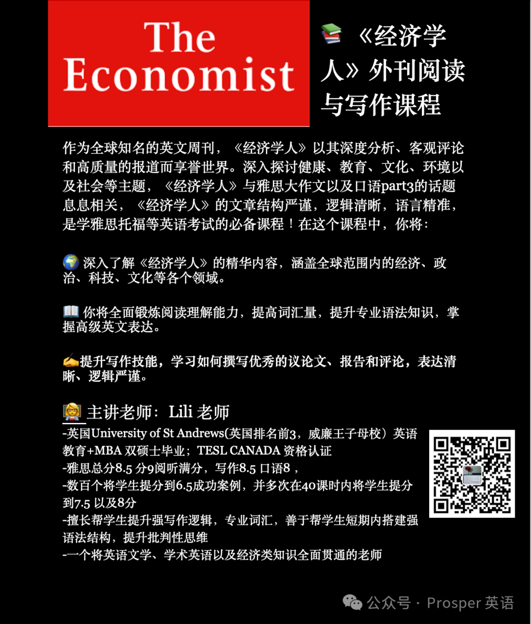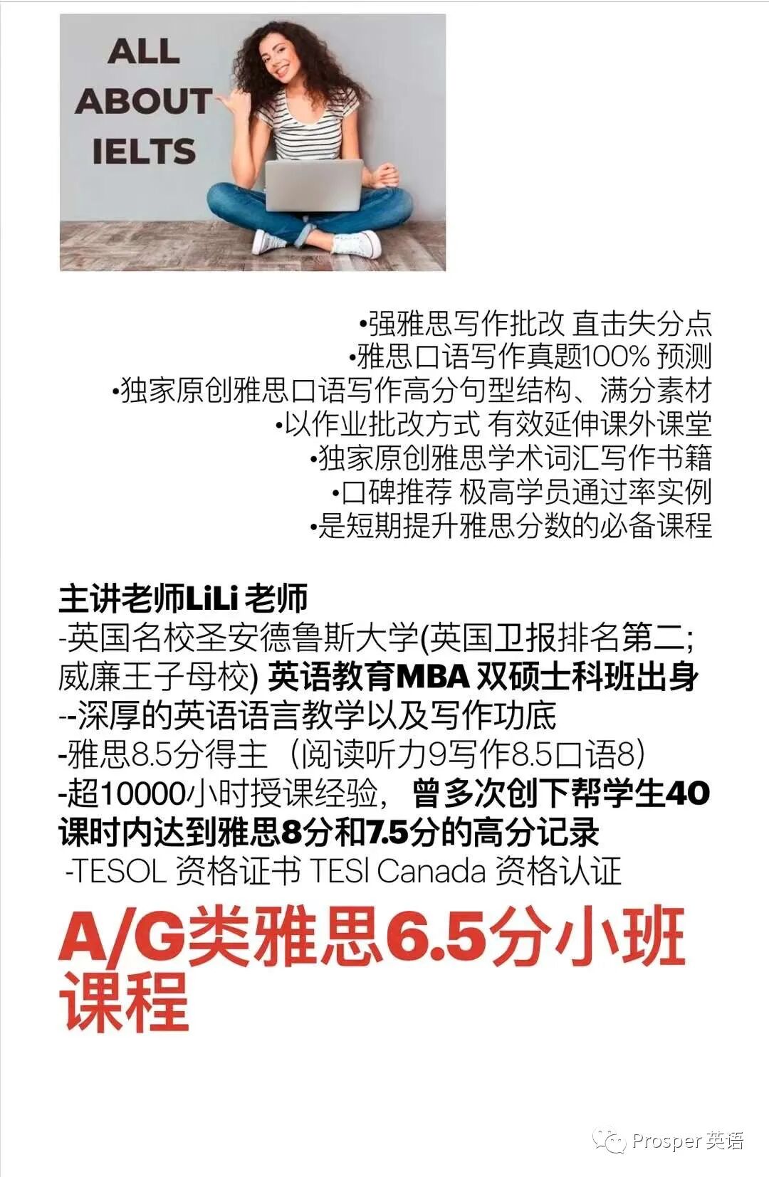 超过10年的教学经验,曾多次创下帮学生40课时内达到雅思8分和7.5分的高分记录,擅长帮学生搭建高分句型结构、满分素材,强雅思写作批改,直击失分点,英国名校圣安德鲁斯大学(英国卫报排名第二; 威廉王子母校) 英语教育MBA 双硕士科班出身,有着深厚的英语语言教学以及写作功底,TESOL 资格证书 TESl Canada 资格认证;