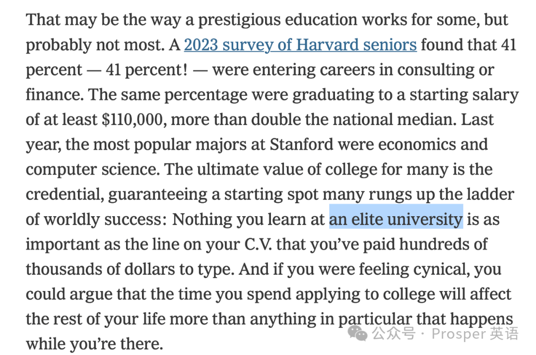 对于一些人而言,拥有声名显赫的教育可能是成功之路,但对大多数人来说可能并非如此。一项对2023年哈佛大学毕业生的调查发现,41%的学生选择了咨询或金融行业的职业。同样比例的人起薪至少达到了每年11万美元,是全国年收入中位数的两倍以上。去年,在斯坦福大学,经济学和计算机科学是最受欢迎的专业。对于许多人来说,上大学的最终价值在于所获得的证书,这保证了他们在世俗成功之梯上有一个较高的起点:在精英大学学到的任何东西都不如你花费数十万美元来填写简历上的那一行重要。如果你有点愤世嫉俗的话,你可以说,你花在申请大学上的时间将比你在那里度过的任何特定时间对你未来的影响更大。