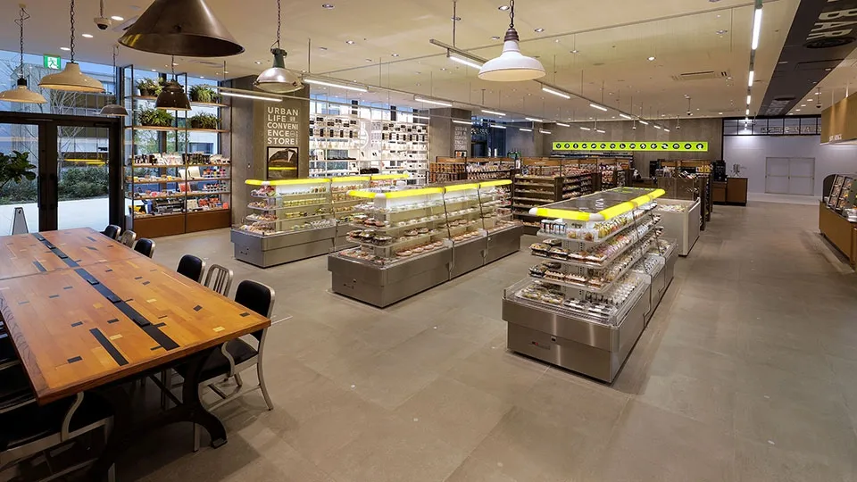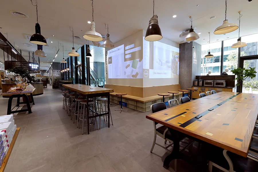 日本东京的一家全家旗舰店,面积很大,区域分工也很多。在这里除了传统的商品售卖,还开设了38个办公位。