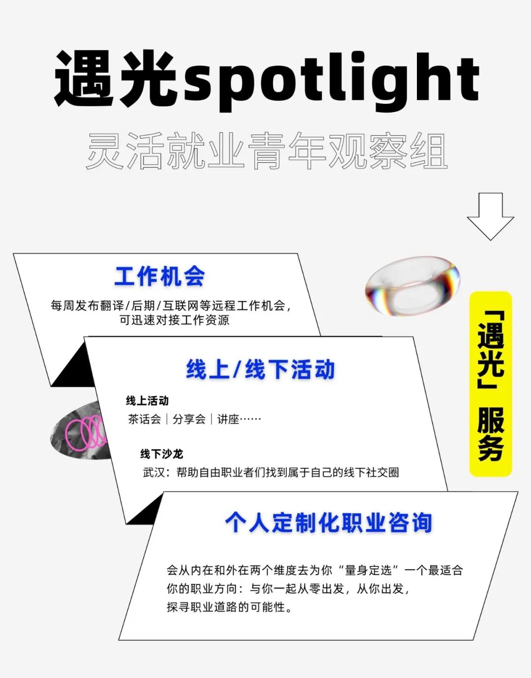我们建立了名为「遇光俱乐部」的社群,会长期大量的在其中分享自由职业的职位需求及项目对接机会,类型包括但不限于翻译、插画、撰稿和配音等,也非常适合数字游民,加入「遇光俱乐部」一定能帮助你节省在互联网上大海捞针般的搜索时间。