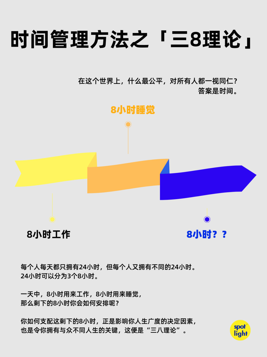 你如何支配这剩下的8小时,正是影响你人生广度的决定因素,也是令你拥有与众不同人生的关键,这便是“三八理论”。