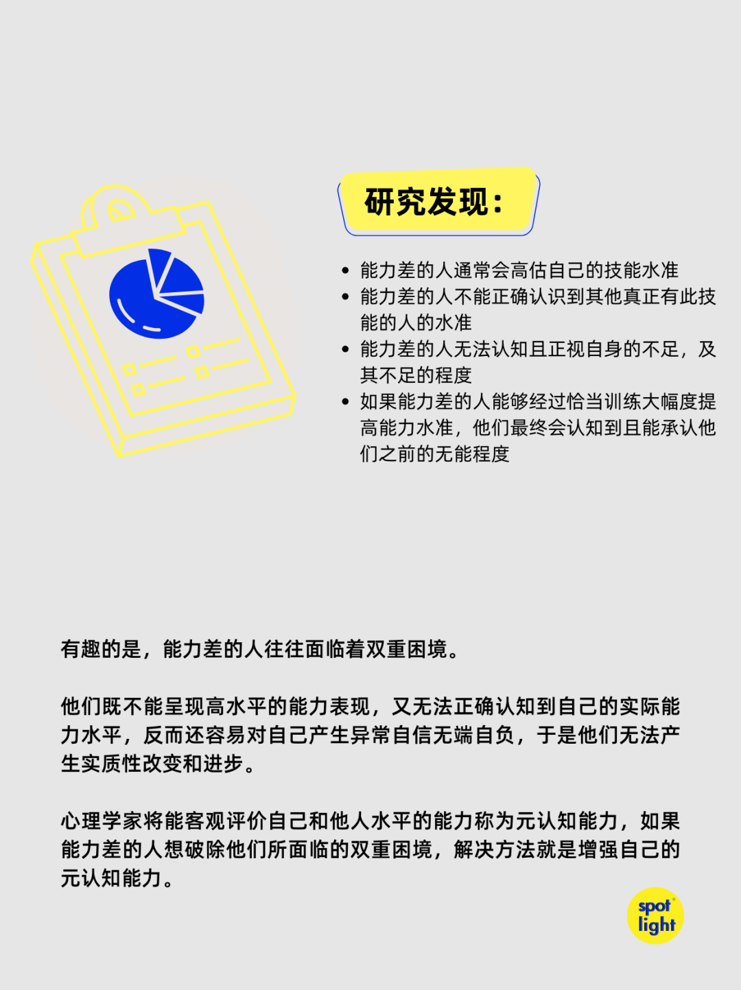有趣的是,能力差的人往往面临着双重困境。他们既不能呈现高水平的能力表现,又无法正确认知到自己的实际能力水平,反而还容易对自己产生异常自信无端自负,于是他们无法产生实质性改变和进步。