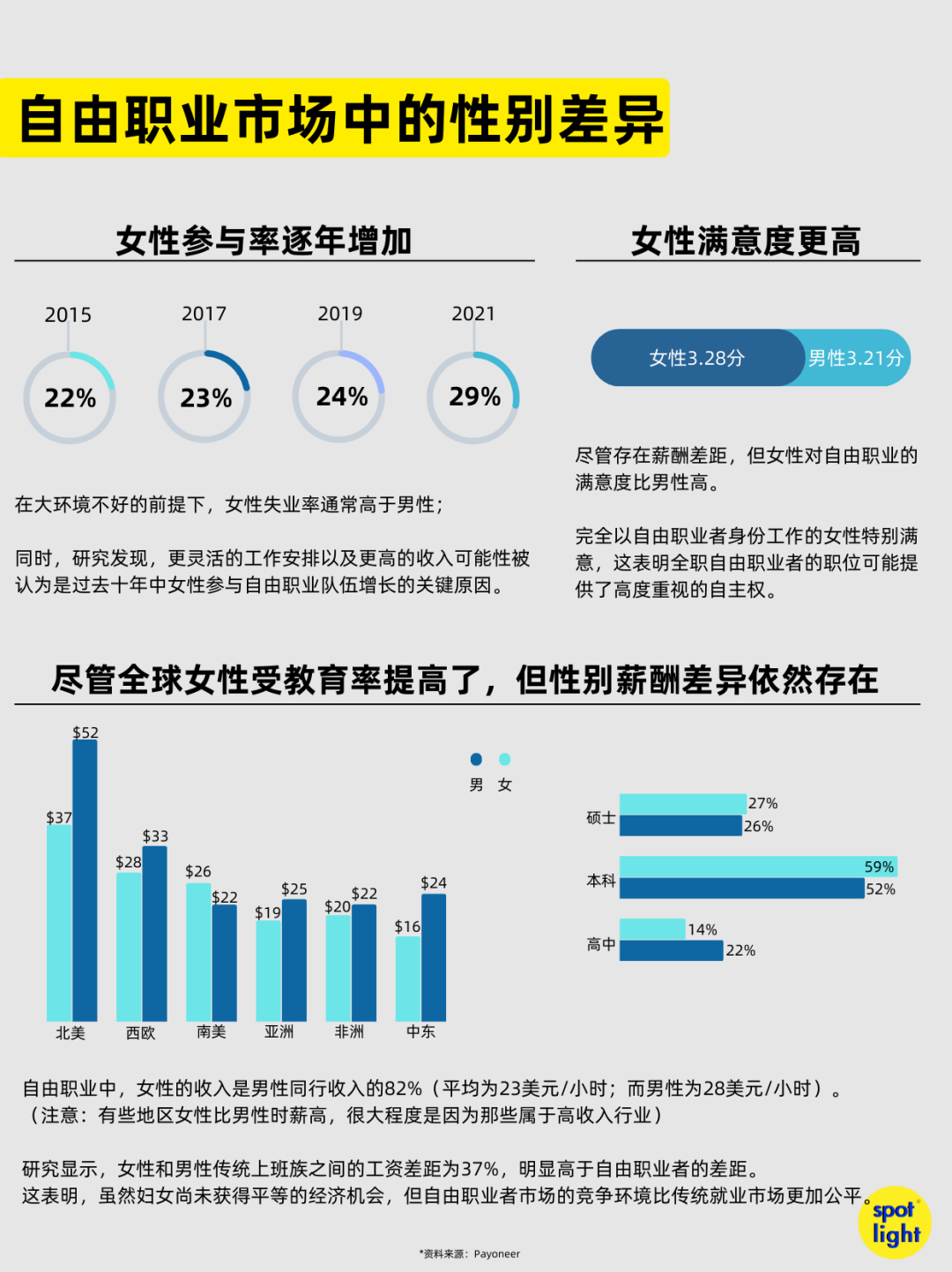 -尽管全球女性受教育程度提高了,但性别薪酬差异依然存在。