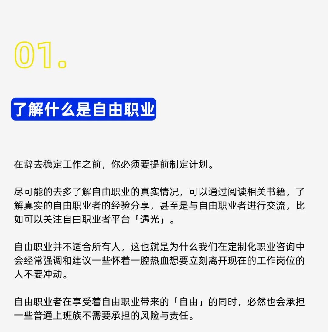 尽可能的去多了解自由职业的真实情况,可以通过阅读相关书籍,了解真实的自由职业者的经验分享,甚至是与自由职业者进行交流,比如可以关注自由职业者平台「遇光」。