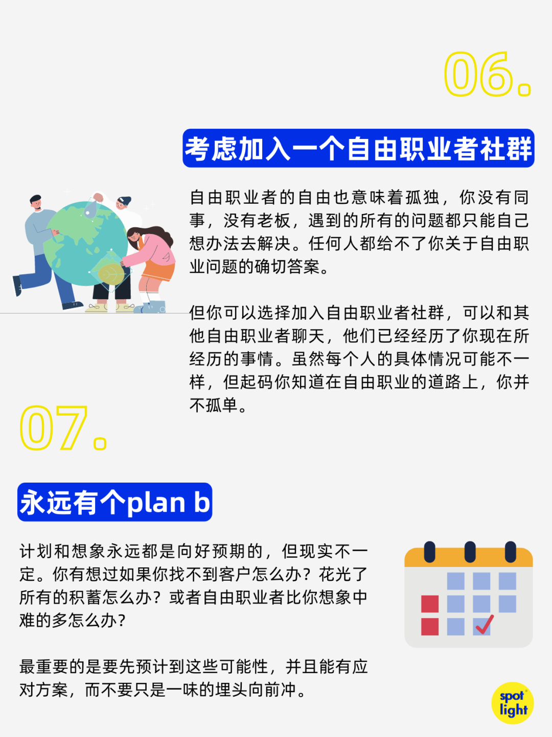 但你可以选择加入自由职业者社群,可以和其他自由职业者聊天,他们已经经历了你现在所经历的事情。虽然每个人的具体情况可能不一样,但起码你知道在自由职业的道路上,你并不孤单。