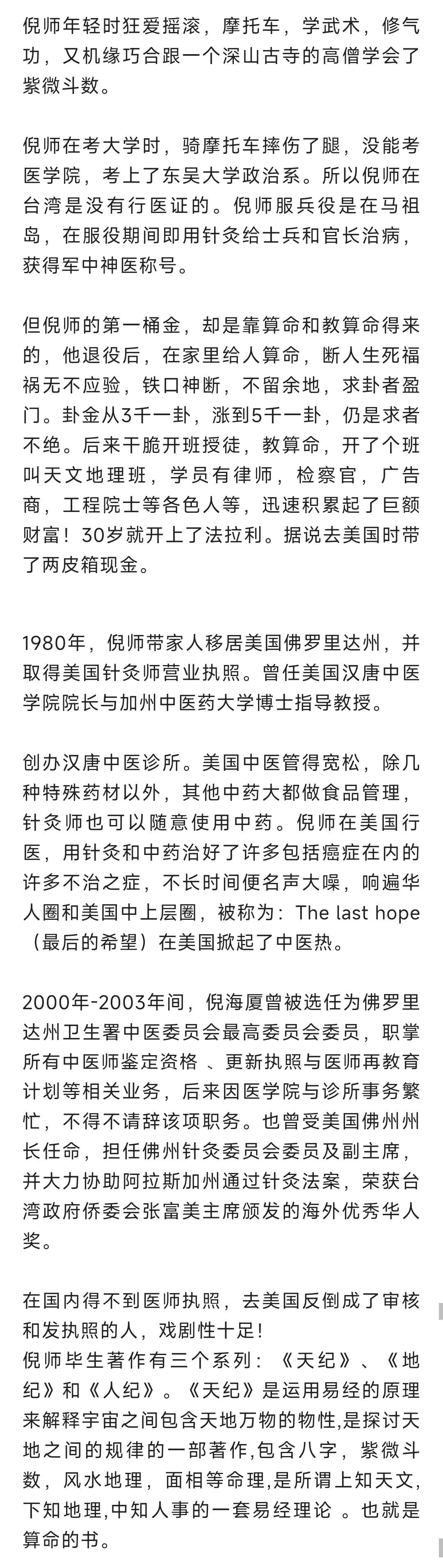 倪海厦穷其一生在干两件事:一是不遗余力在传播中医,开班收徒,广纳弟子。他选徒严格,收徒要先观面相,无慧根无德者不要,想当年我也急欲跟师倪师学习,可惜去不了美国也去不了台湾,遗憾!二是不遗余力抨击攻讦西医西药,抽着机会就狂怼西医和资本控制下的药企。言语激愤!恨之入骨!