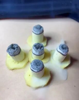 这上面直接放五块生姜,五片生姜,五个灸,直接在上面灸,叫梅花灸,就统治一切胃病。