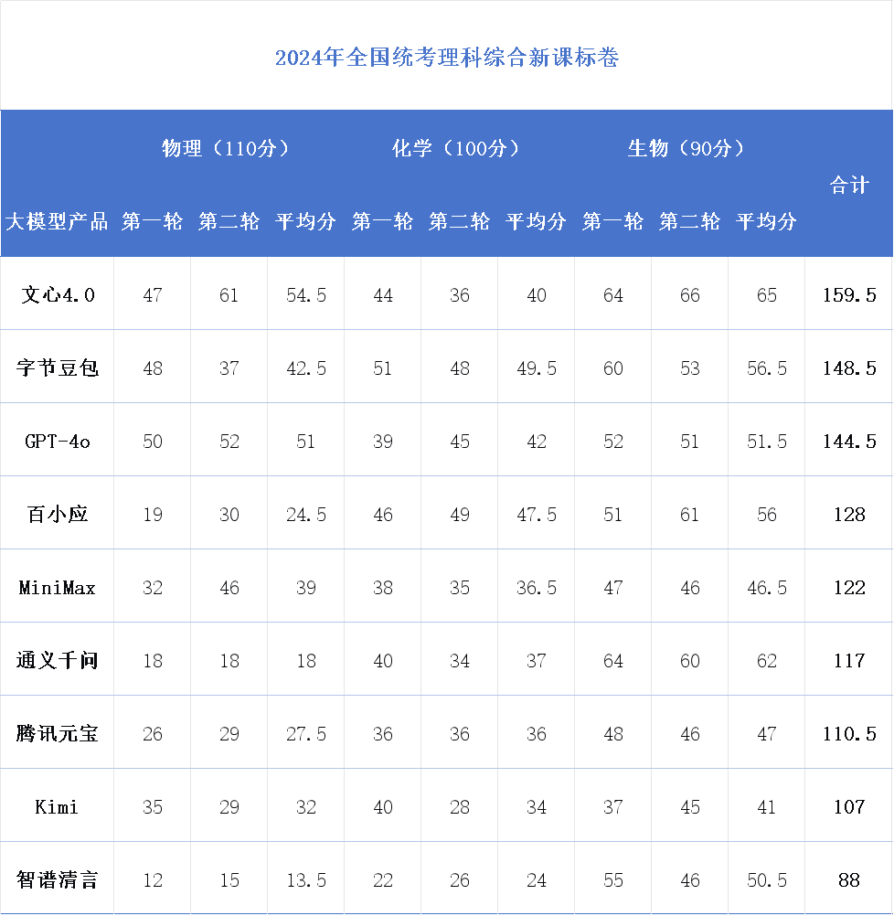 2024年AI高考,文科最高分562分,理科最高分469.5分。文科最低分437.5分,理科最低分362分。GPT-4o包揽了高考文理状元,智谱清言在9个“考生”中倒数第一。