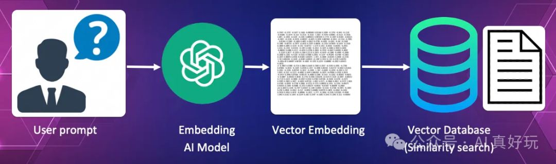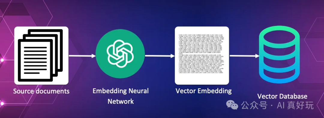 在此过程中,每个源文档都会被输入到嵌入人工智能中,由人工智能创建向量嵌入。然后,这些向量嵌入连同对原始源文档的引用一起保存在向量数据库中。