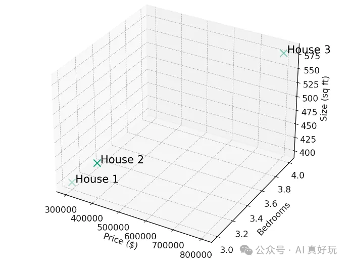 让我们来看一个非常简单的例子,我们只有三个数据点来表示每栋房子。数组的每个元素将代表房屋的不同特征。比如: