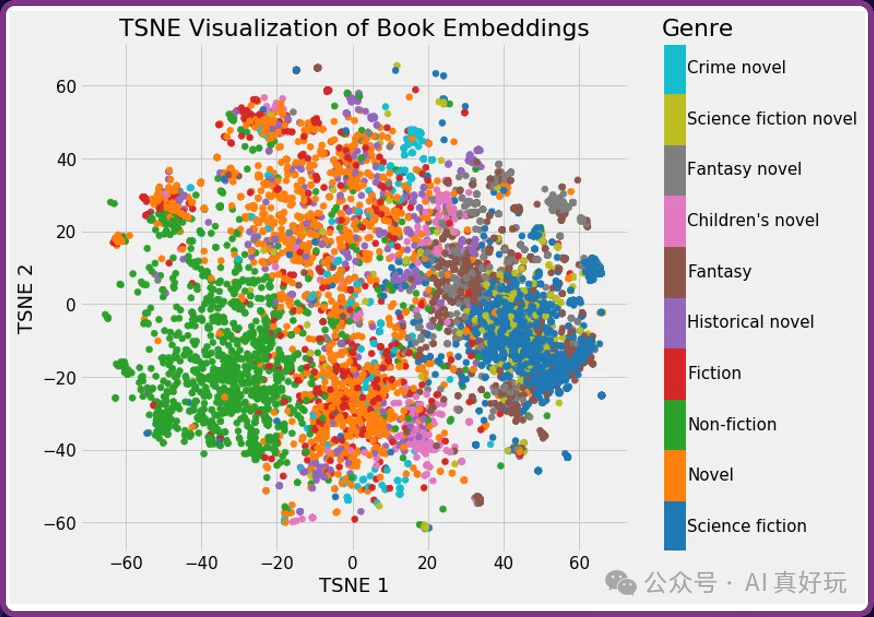 另一个例子可能是获取图书馆书籍的摘要并将其转换为向量嵌入。下图显示了按类型分类的书籍。您会发现这些书往往会分成几组。