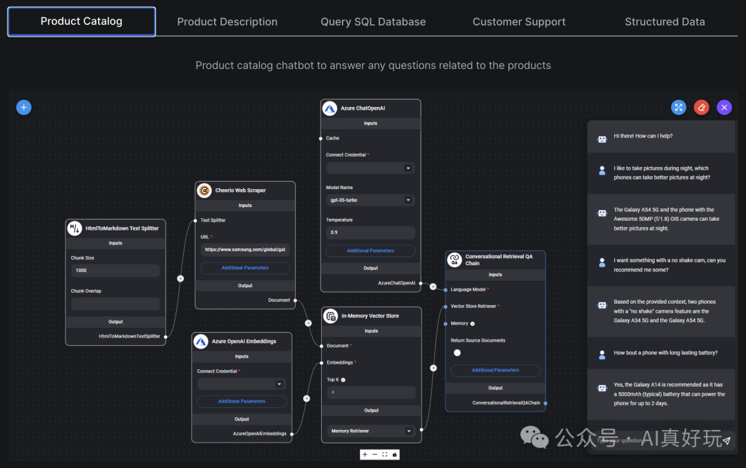 开箱即用的组件:内置了 LLMs、Loaders、Memories、Vector Stores 等功能组件;