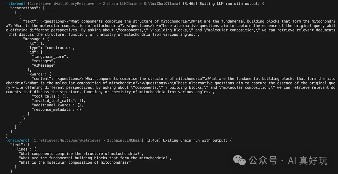 在调用 Llama 3 服务时,会所使用 MultiQueryRetriever 默认的提示词模板生成 3 个不同维度的相关问题: