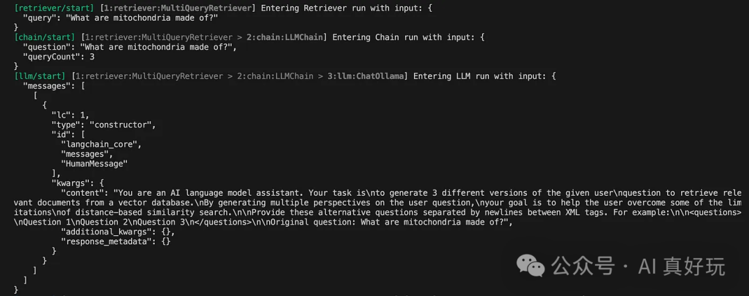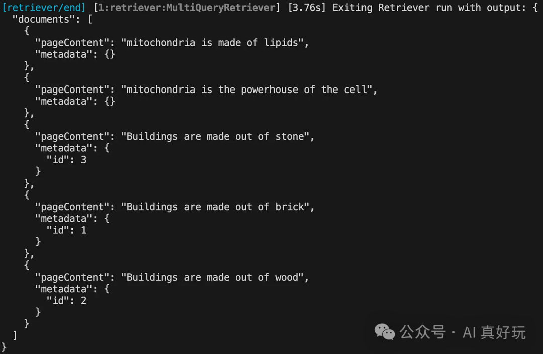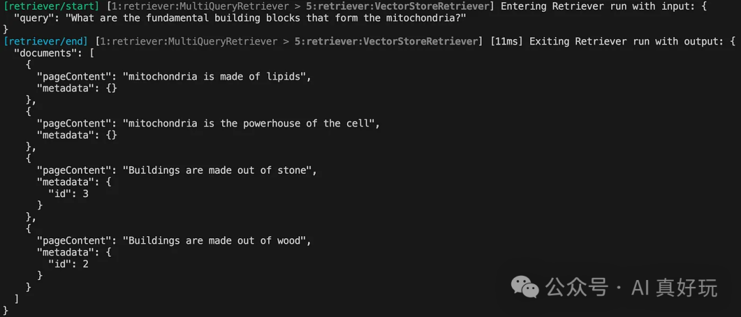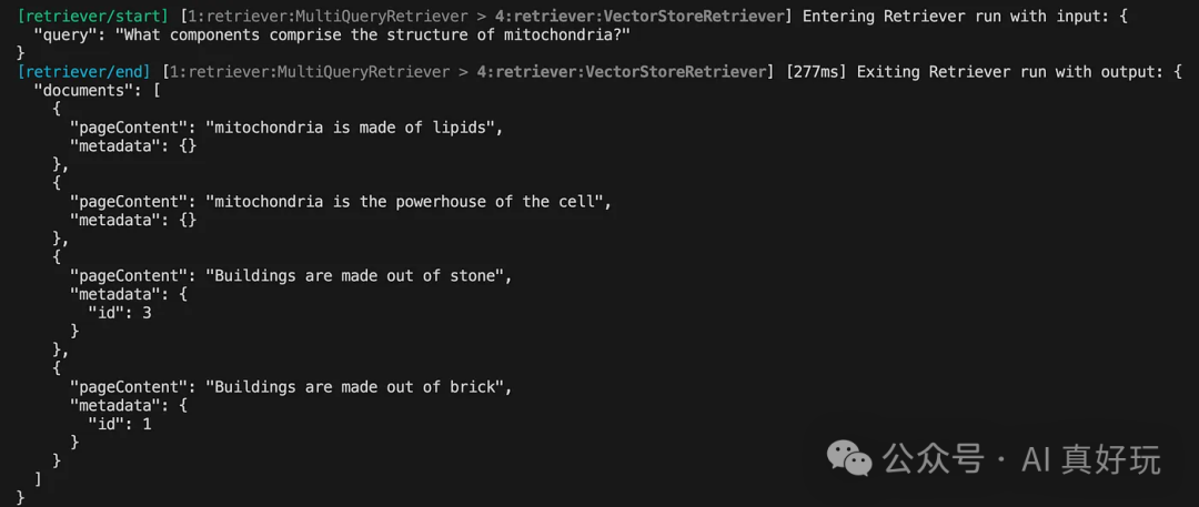 在以上代码中,我们使用 MultiQueryRetriever.fromLLM 方法创建了 retriever 对象,其中 verbose 参数用于在终端输出 MultiQueryRetriever 的执行过程。创建了 MultiQueryRetriever 对象之后,我们就可以调用该对象上的 getRelevantDocuments 方法来获取与用户输入问题相关的文档集: