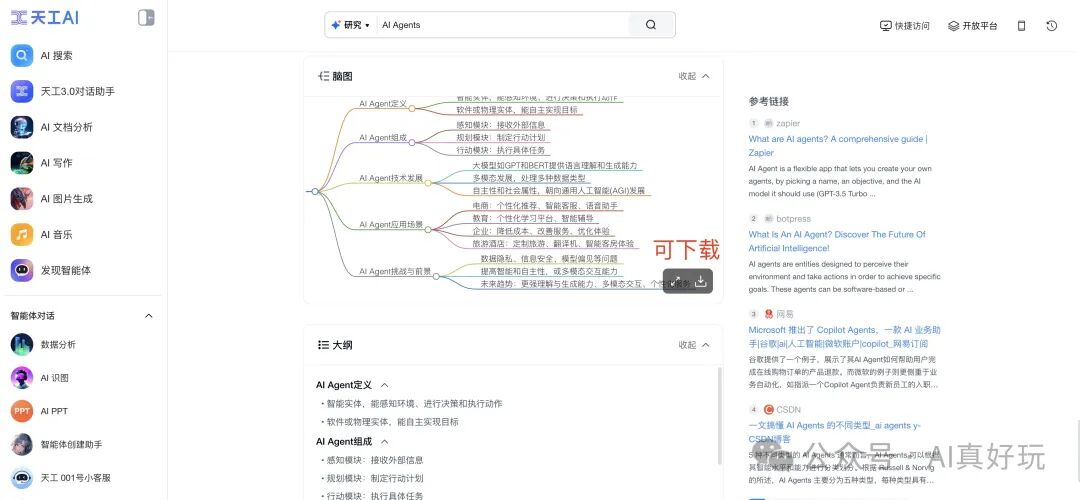 生成的 AI Agents 大纲非常不错,条理和结构都很清晰。通过天工 AI 的搜索能力,我们一次性完成了 “制作分享大纲” 和 “收集每个子主题的相关资料” 这两个步骤,真可谓一步到两位!!!