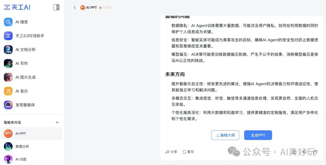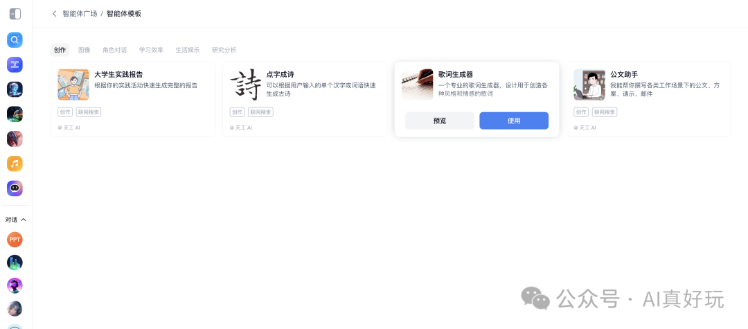 以上就是利用天工 AI 来完整制作 AI Agent 课题 PPT 报告的完整流程。但其实,天工 AI 也支持智能体的创建,官方也发布了大量有趣好玩的智能体。接下来带大家体验用天工 AI 来创建 “歌词生成器” 智能体。