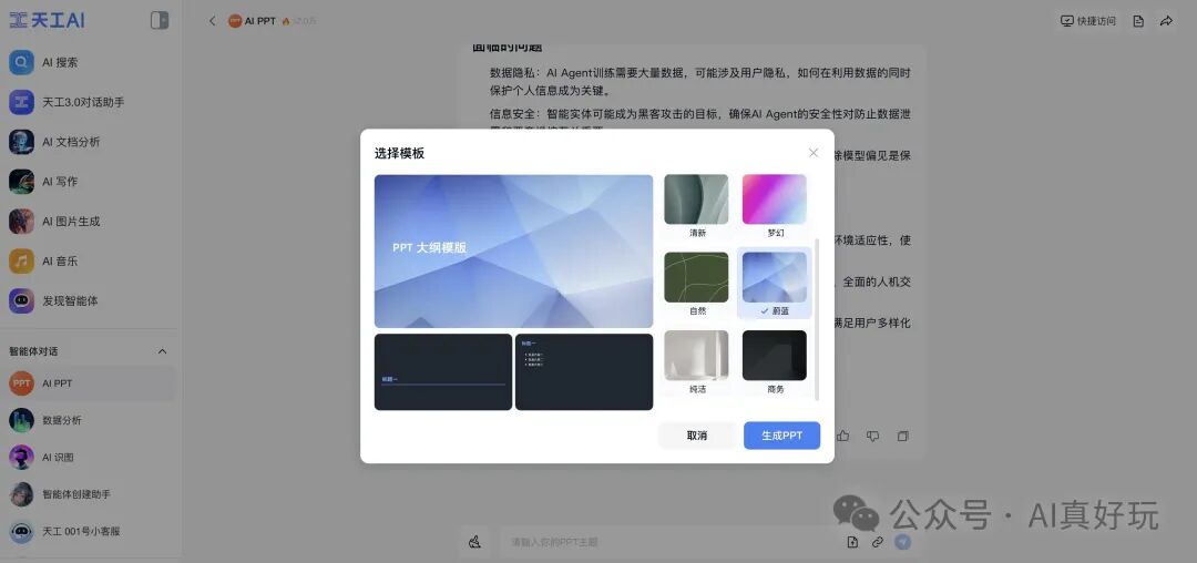 因为我们已经有了大纲,所以可以让 【AI PPT】 智能体基于 AI 搜索生成的大纲来自动生成 PPT。