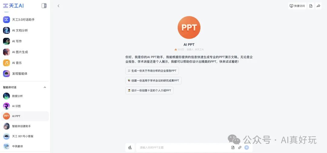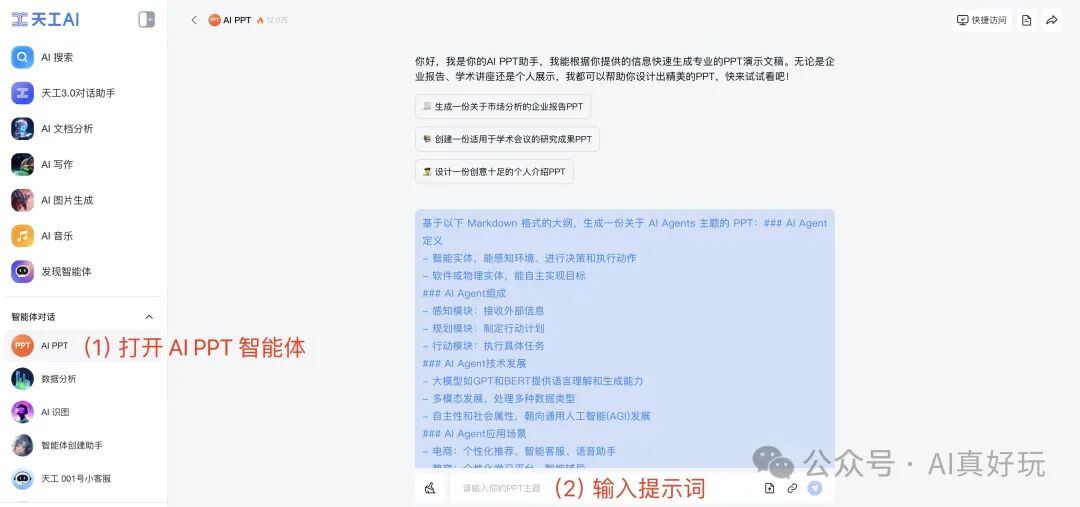 打开 【AI PPT】 智能体对话框之后,在输入框输入以下提示词: