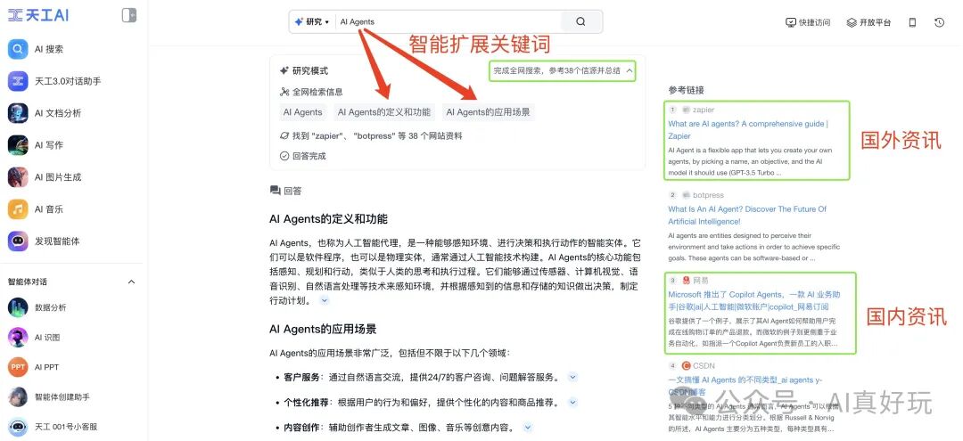 之后,就是见证奇迹的时刻了。AI 搜索不仅帮我们自动扩展了搜索关键词,还会自动开启全网检索模式,包含国内外资讯,并同时检索网页和图片。
