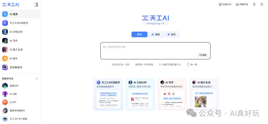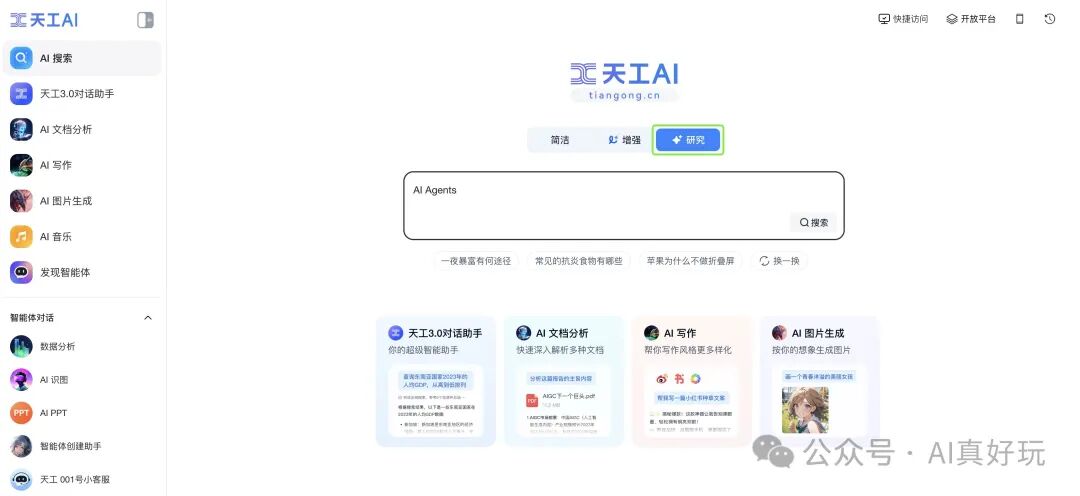 本次分享中,我将重点使用天工 AI 的两项功能:AI 搜索和 AI 智能体(AI PPT)。其中,AI 搜索是我最喜欢的功能,也是我日常使用最多的功能。