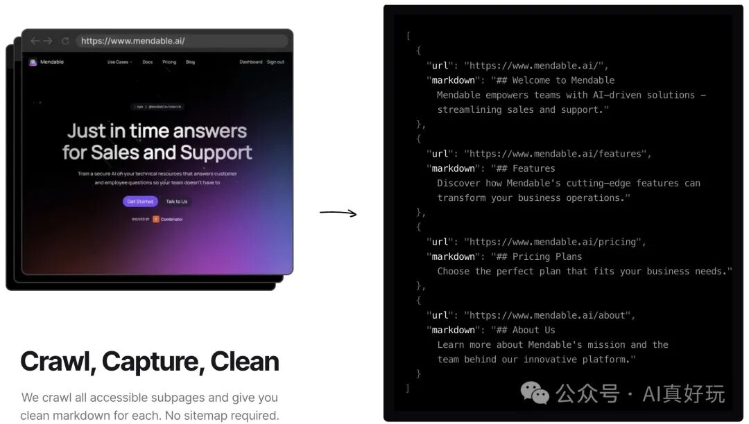 crawl 模式:抓取网站和所有可访问的子页面,并 Markdown 格式返回每个子页面。