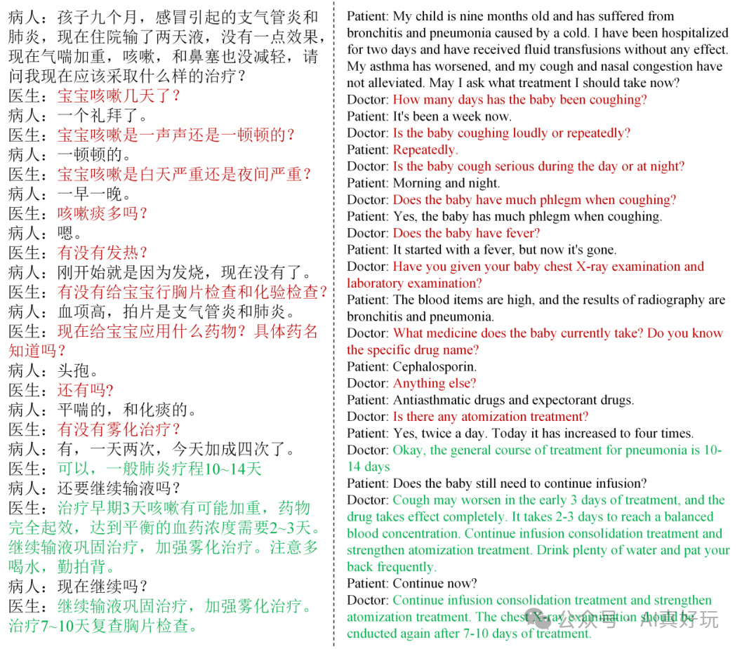在训练数据中,包含了大量的医生问询文本,这些文本并非直接提供建议,而是以提问的形式出现。这种设计有助于增强 AI 模型在进行医疗对话时的询问技巧,从而更有效地获取用户信息。