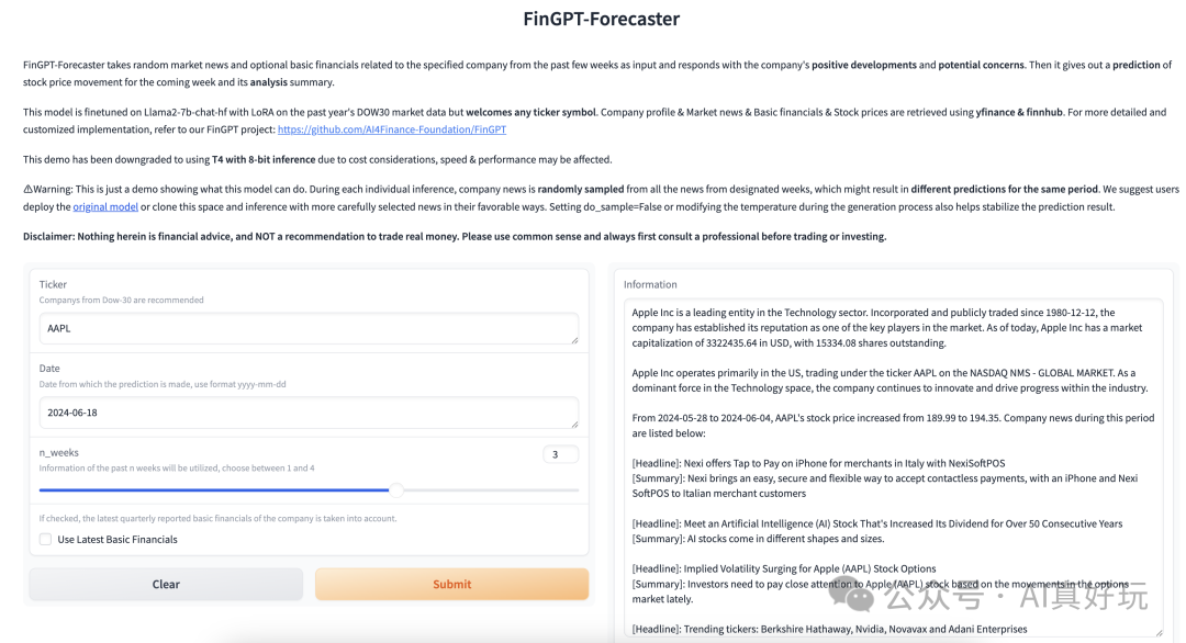 FinGPT-Forecaster[2] 将过去几周与指定公司相关的随机市场新闻和可选基本财务数据作为输入,并对公司的积极发展和潜在问题做出回应。然后,它会给出未来一周的股价走势预测及其分析摘要。