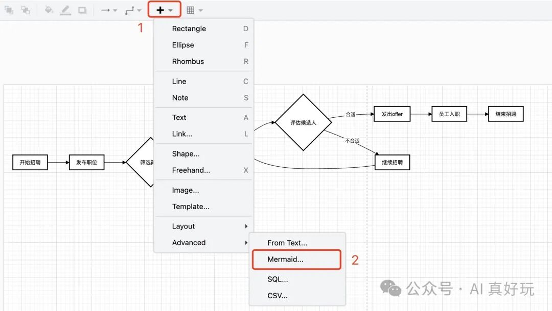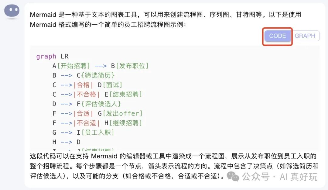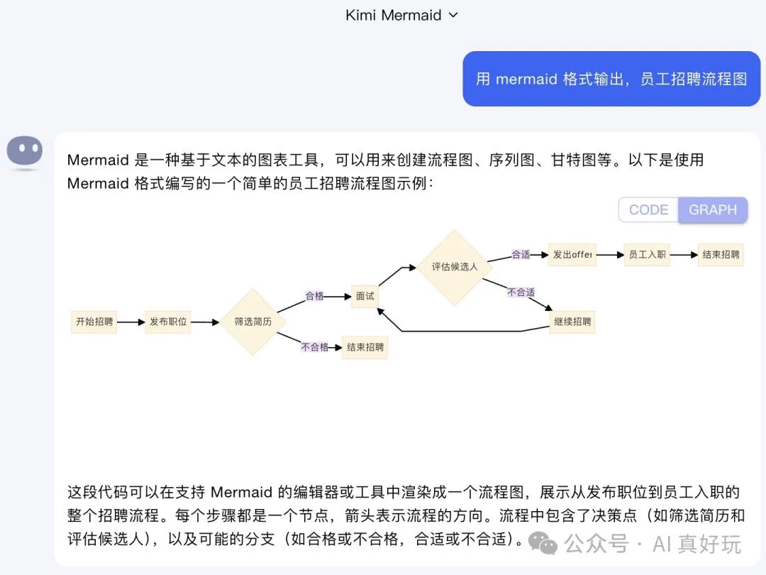 在上图中,我们只要让 Kimi 用 mermaid 格式输出 “员工招聘流程图”,它就能帮我们生成想要的流程图了。如果生成的流程图不满意,你还能让它不断地修改。当然,你也可以手动修改流程图。只需切换到 CODE 面板,然后复制里面的代码到支持 mermaid 的编辑器即可。