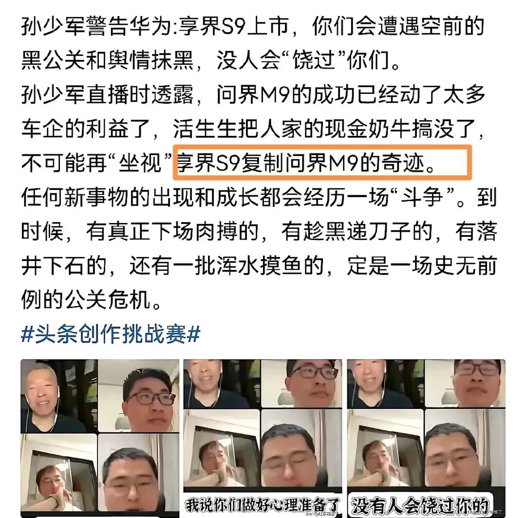 车界打开孙少军最近也在好意提醒华为享界S9这款车,一定会被遭遇空前的黑公关和舆情抹黑,就看华为能不能很好处理这一次公关危机了。