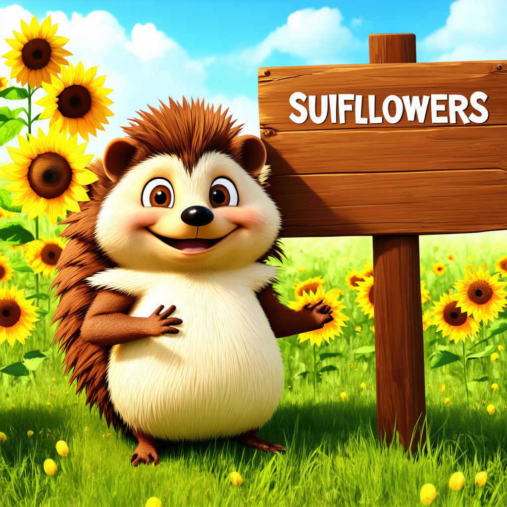 A pixar style illustration of a happy hedgehog, standing beside a wooden signboard saying "SUNFLOWERS", in a meadow surrounded by blooming sunflowers