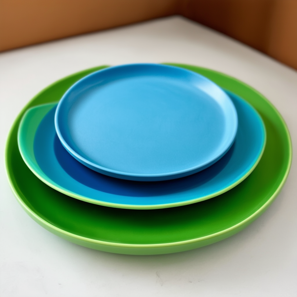 A stack of 3 plates. A blue plate is on the top, sitting on a blue plate. The blue plate is in the middle, sitting on a green plate. The green plate is on the bottom.
