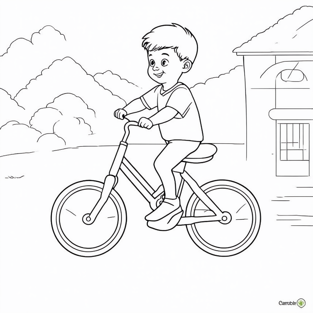 A very simple, clean and minimalistic kid's coloring book page of a young boy riding a bicycle, with thick lines, and small a house in the background
