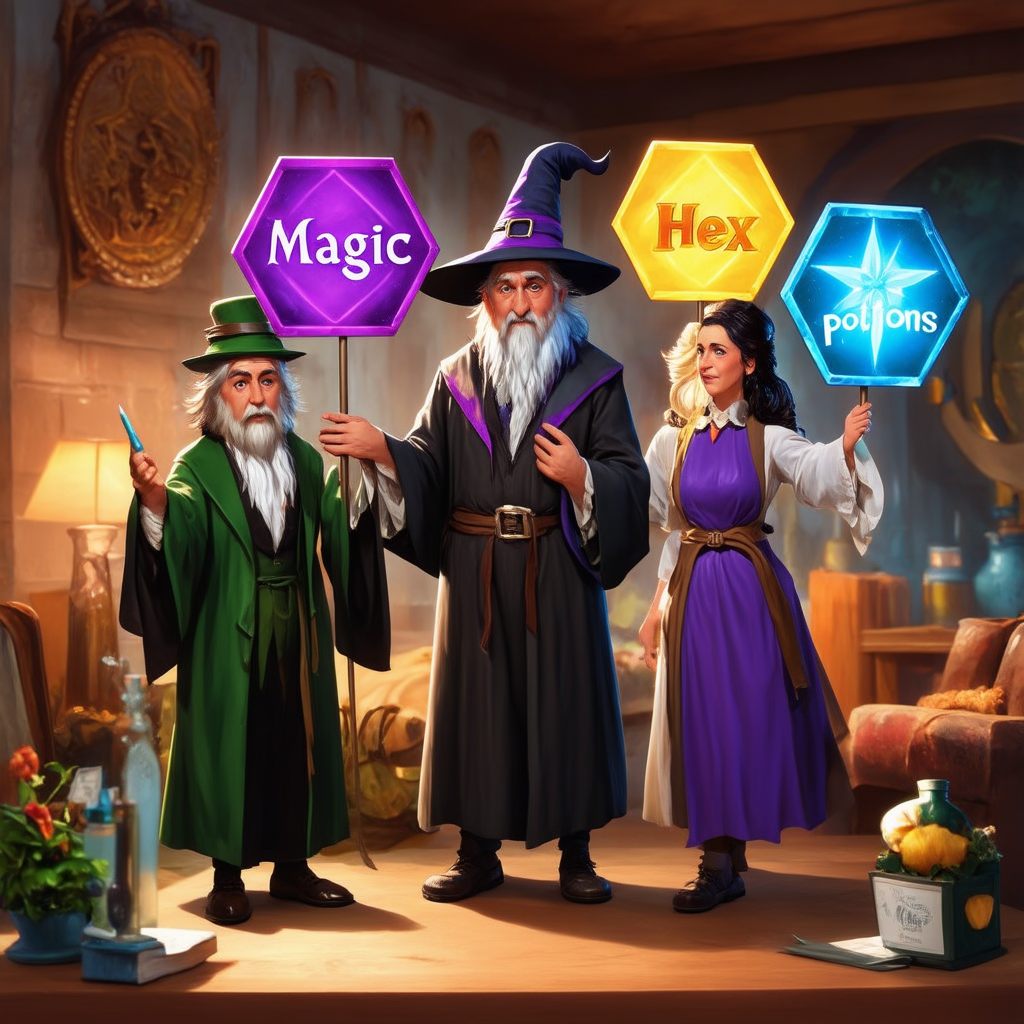photo of three people, a wizard holding the sign with the text "Magic", a witch with the sign "Hex" and another alchemist with the sign with the text "potions". Indoor scene, colored signs